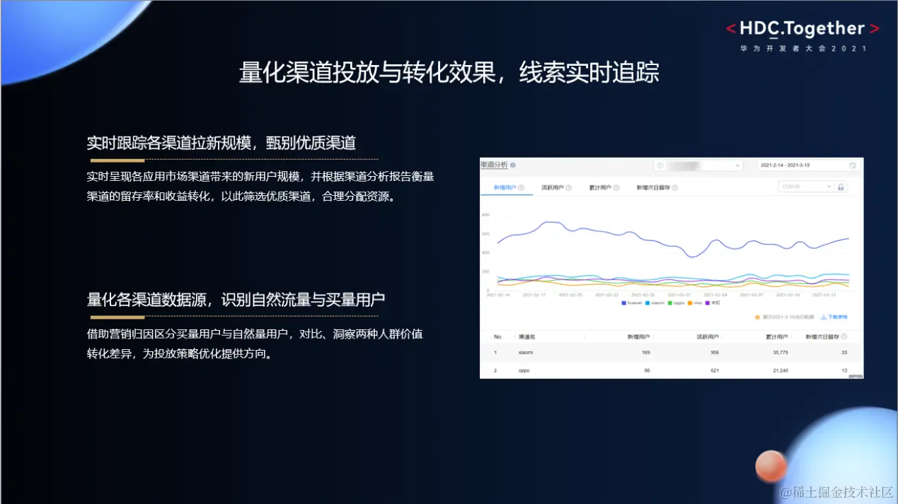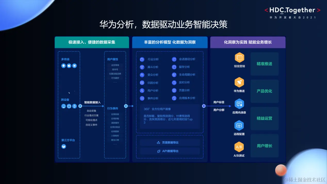 10.22-10.24华为开发者大会2021(Together)在东莞如期举行。本次大会上,HMS Core华为分析服务作为多平台、跨设备的一站式数据分析平台以数据驱动业务智能决策为理念,带来了数智化营销闭环增长方案,获得了开发者们的高度认可。