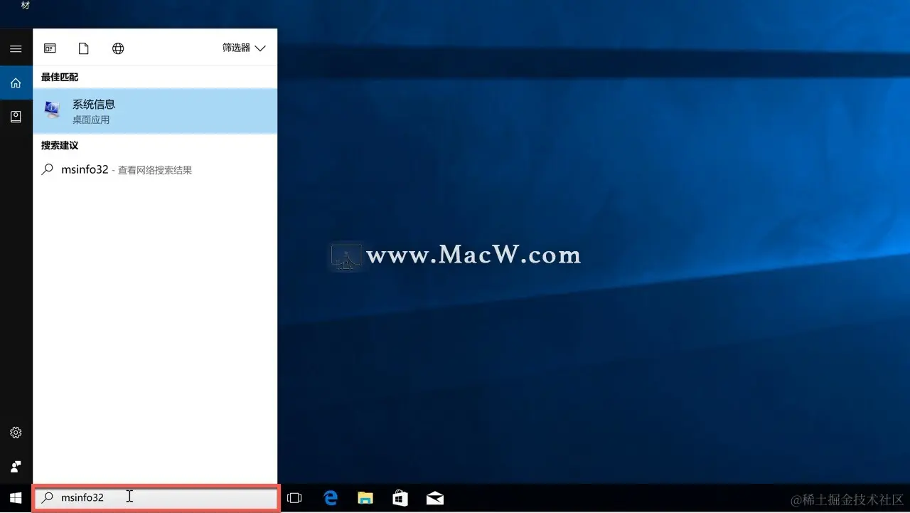 2、单击任务栏上的搜索图标 并输入 msinfo32,然后按Enter。