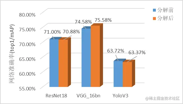 经测试,13张经典CV网络经过张量分解后,推理时间平均减少24.4%,模型大小平均减少38.8%,而finetune后的精度几乎与分解前相当(最大损失不超过0.5%)。