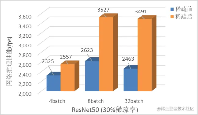 性能方面,主要测试了ResNet-50在不同batch-size情况下的性能情况,在batch-size=32场景下通道稀疏约提升了40%的推理速度。