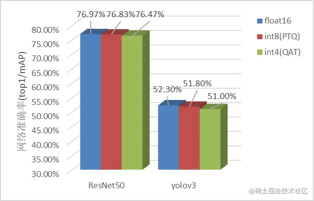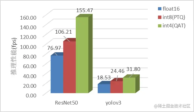 性能方面,不同模型由于其模型结构及网络规格的差异,量化所获取的性能提升也各不相同,其中ResNet-50 INT8相较于FP16,INT4相较于INT8而言平均约有40%左右的性能提升;YOLOV3则都在30%左右。