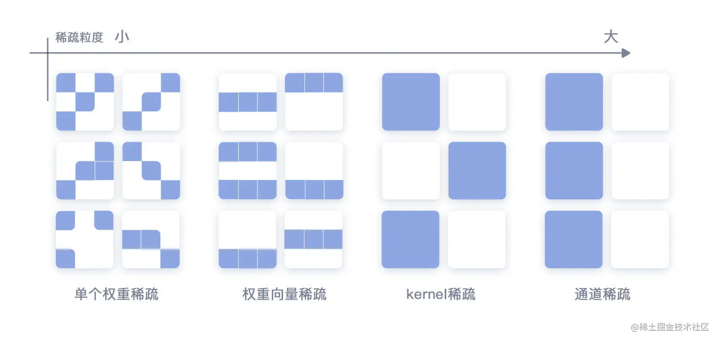 以上稀疏颗粒度示意图,从左到右颗粒度依次增加。但是对于单个权重、权重向量、单个卷积核kernel的稀疏都需要硬件特殊适配才能够拿到对应的性能或者存储收益。
