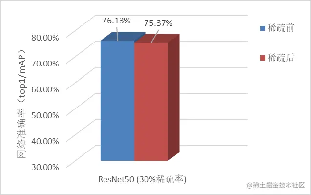 在昇腾AI处理器上分别测试了ResNet-50网络进行30%稀疏的精度和性能表现。