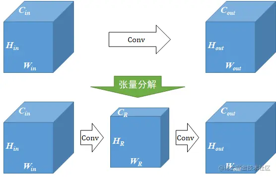 而张量分解,正是采用数学方法,将一个大卷积核通过低秩近似分解为多个小卷积核,构造计算量更小的卷积算子,从而达到压缩模型与计算量的目的。