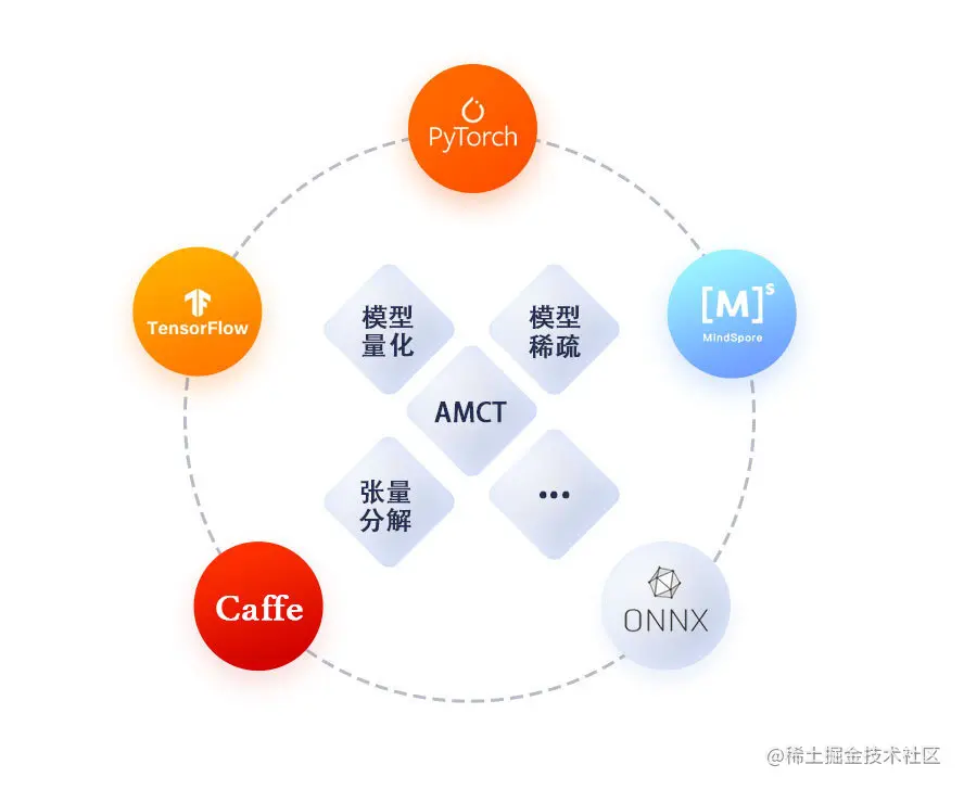AMCT是一个python工具包,有效适配Caffe/TensorFlow/昇思MindSpore/PyTorch/ONNX等主流深度学习框架,提供包含量化、张量分解、通道稀疏在内的多种模型压缩功能。在保证模型精度前提下,可有效降低模型的存储空间和计算量,提升模型推理性能。