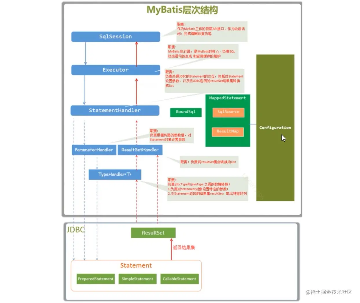 Configuration 是mybatis的所有配置信息,分成全局的配置文件和映射的配置文件,映射的配置文件里面存储了相关的sql操作,MapStatement封装了sql的操作 ,sqlSource动态生成的sql语句并且封装到BounSql 中去 ,ResultMap自定义数据结果集。