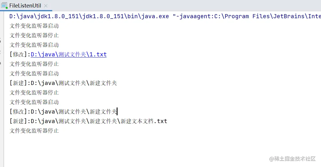 此处记着,在重写的方法里加上标志,以便可以观察到文件变化监听在控制台的日志,监听器可以监听文件和文件夹的增加、删除、修改的状态我们执行一下看下结果;为了测试结果,我将监听的轮询时间调成了十秒一次;