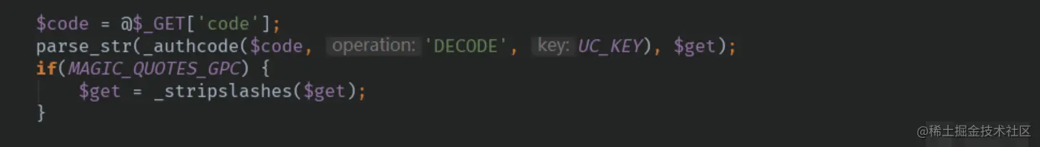 在/3/ucenter_api/api/uc.php中,通过get传参code,再将_authcode解密后的code利用parse_str解析并赋值给$get