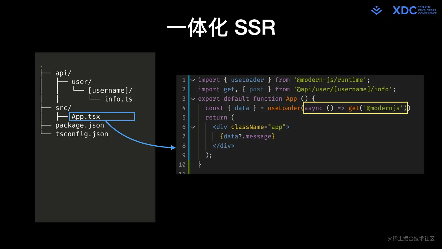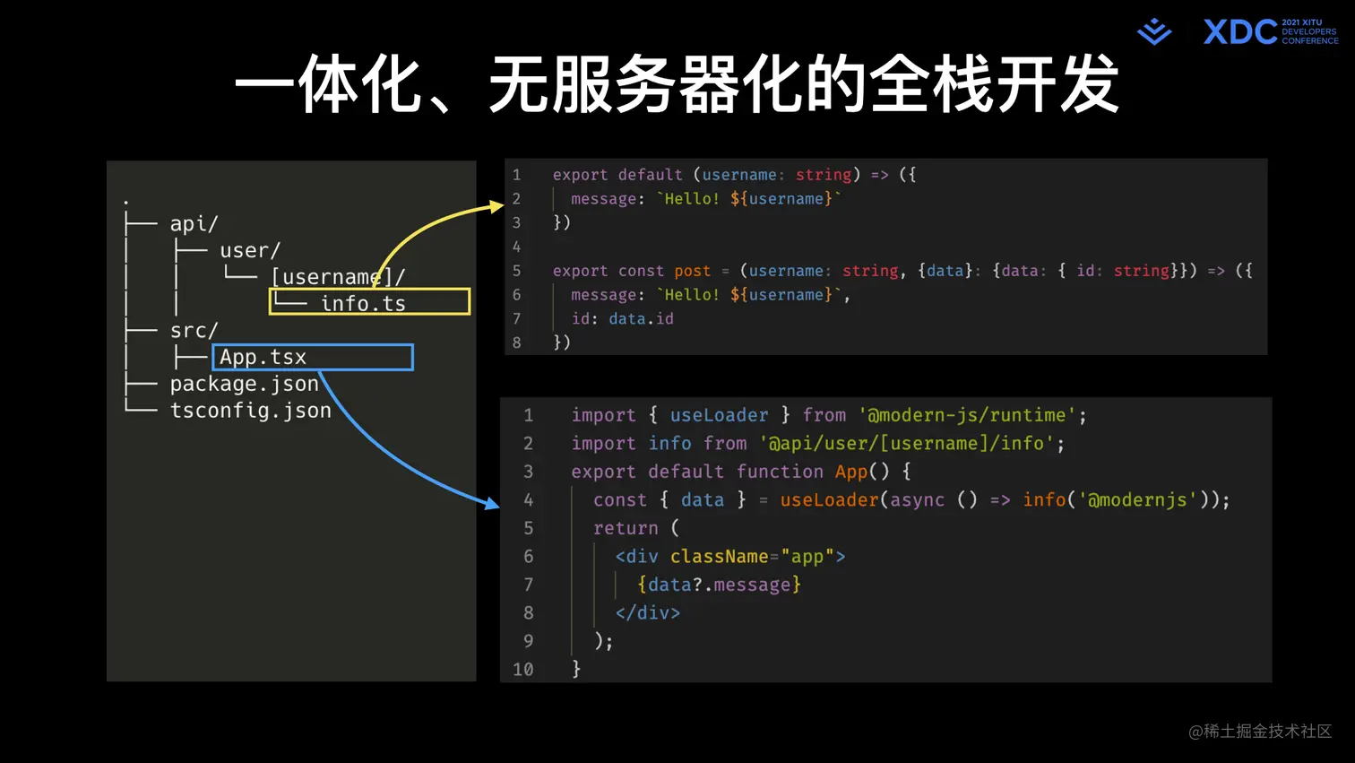 幻灯片上是这次分享中第一个 Modern.js 的 demo, 左侧是一个 Modern.js 应用项目的完整目录结构,src/ 目录下的应用主体,可以像调用普通函数文件一样访问 api/ 目录下的 BFF 函数,不需要了解网络细节,Modern.js 会自动基于 BFF 函数的路径、参数等自动生成 REST API,在 CSR 过程中自动请求。