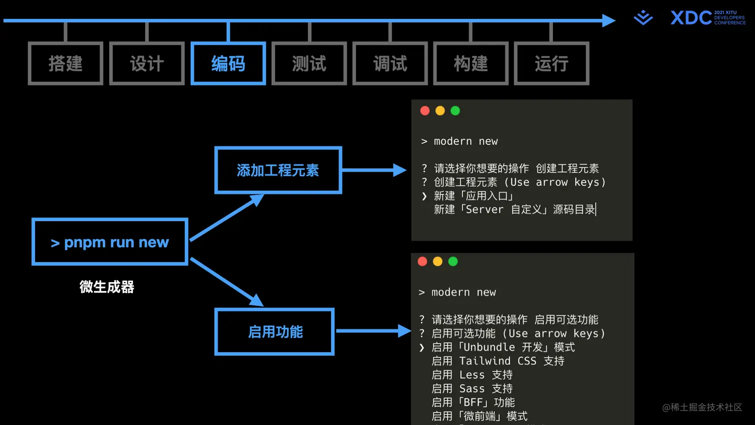 在编码环节,可以通过微生成器启用某个功能或者添加入口,从 SPA 迁移到 MPA。和前面提到的通过研发平台 「低码提效」类似,还可以像图上那样在项目目录下执行 new 命令选择要启用的功能。这个命令会自动重构我们的代码。