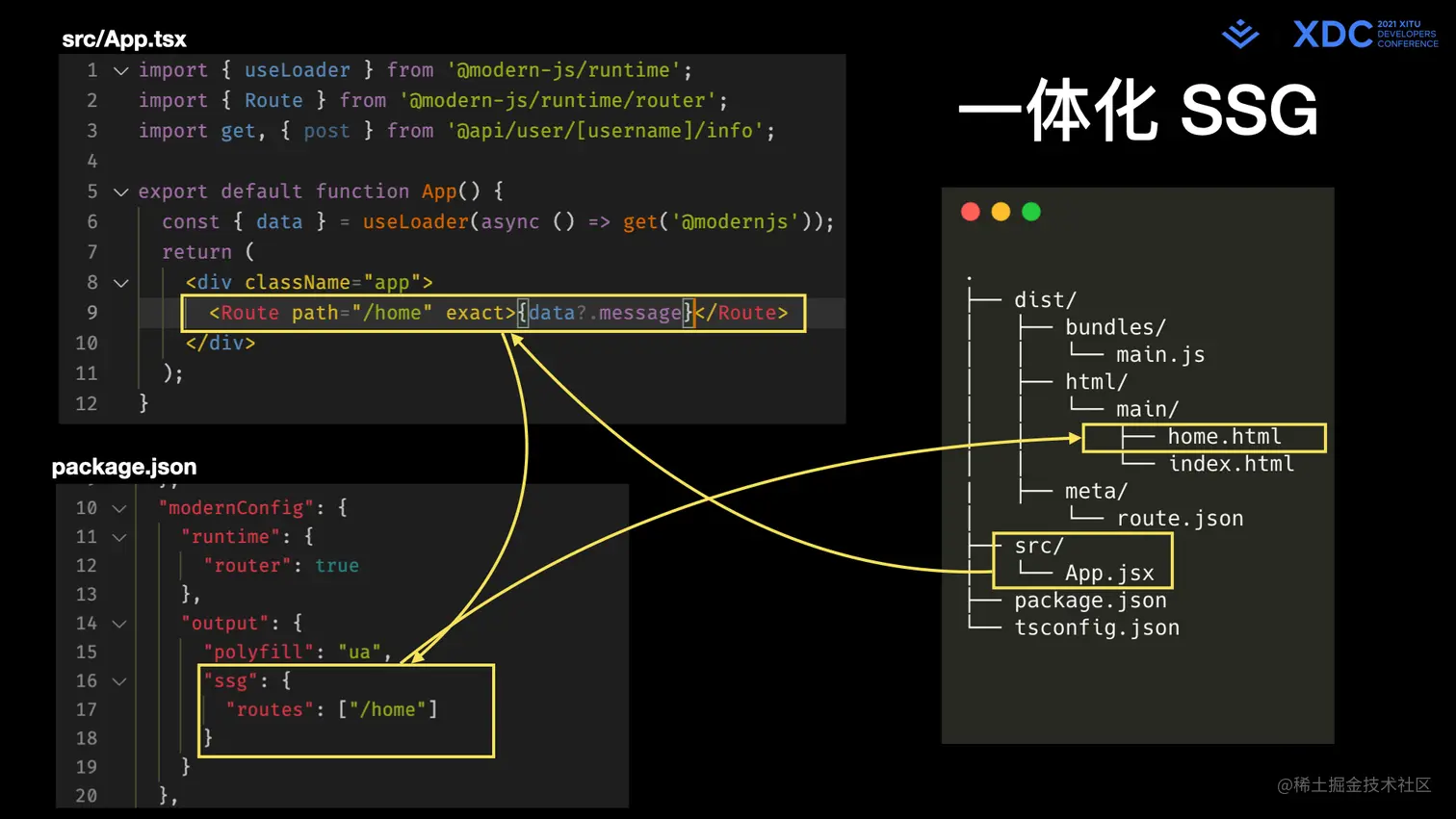 SSG 实际上就是在编译时运行的 SSR,在 Modern.js 里只要配置 SSG 路由,就会自动启用这种编译逻辑,给路由生成静态 HTML。CSR、SSR、SSG 都是用同一份代码。