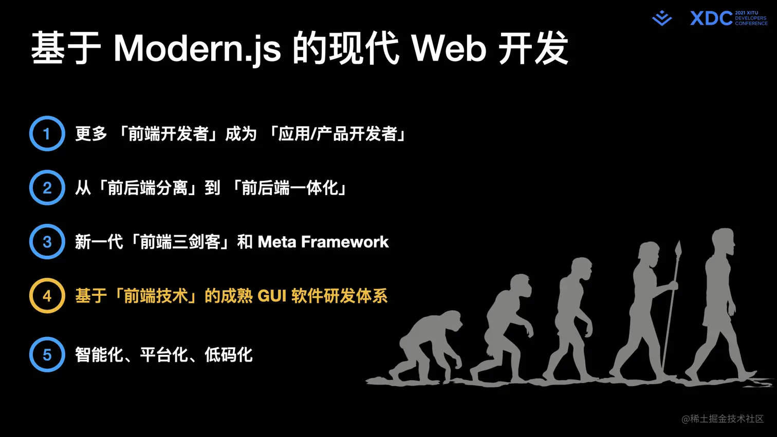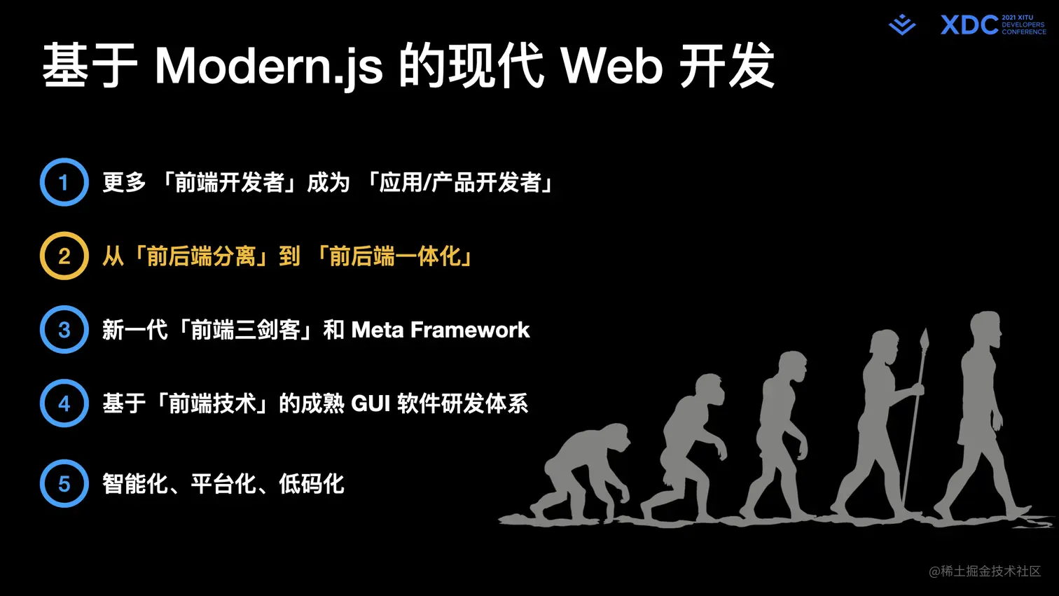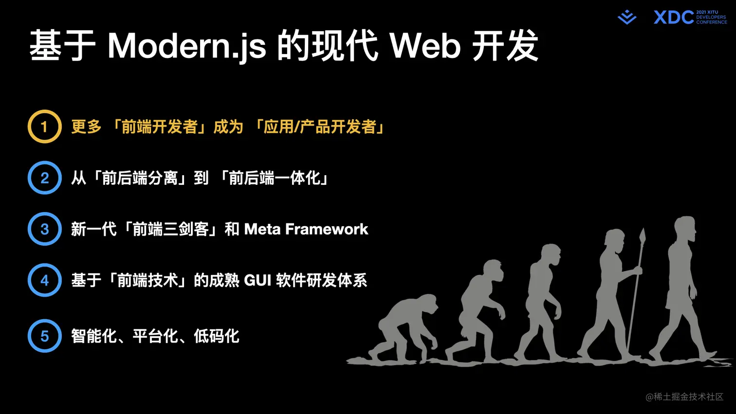 10 月 27-28 日的稀土开发者大会上,字节跳动 Web Infra 正式发起 Modern.js 开源项目。在专场分享《介绍 Modern.js —— 现代 Web 工程体系》中,第一部分先介绍了业界和字节内部的前端开发、Web 开发在发生哪些影响深远的变革,从这些变革的角度,展示了基于 Modern.js 的现代 Web 开发。