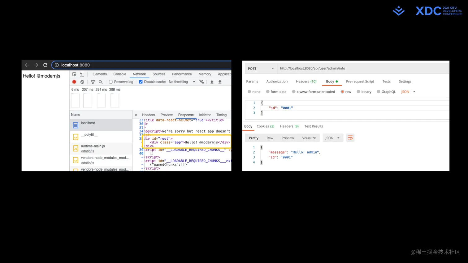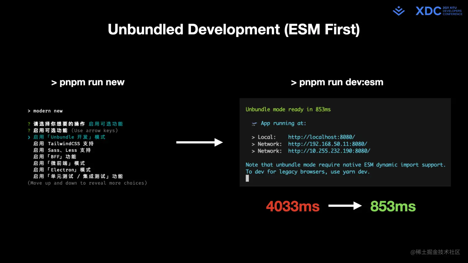 Modern.js 中也内置类似 Snowpack、Vite 的不打包开发调试模式,图中左侧启用该功能之后,运行效果就像图中右侧那样,开发服务器在秒级启动。