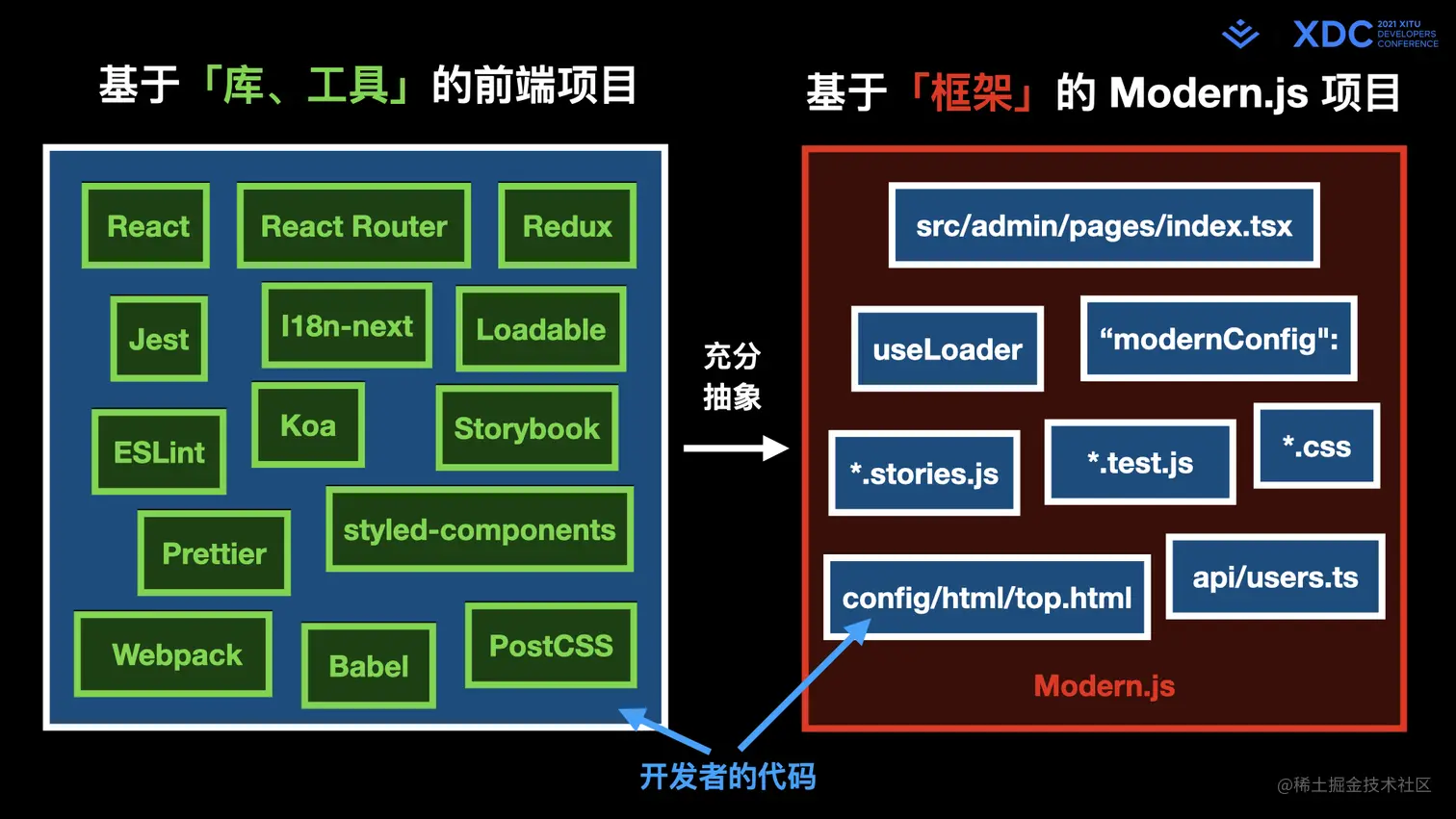 先明确了「前端技术」的定义, 结合 Modern.js 的功能和设计,讨论了如何实现「充分抽象」,才能解决 DX 和 UX 的矛盾。