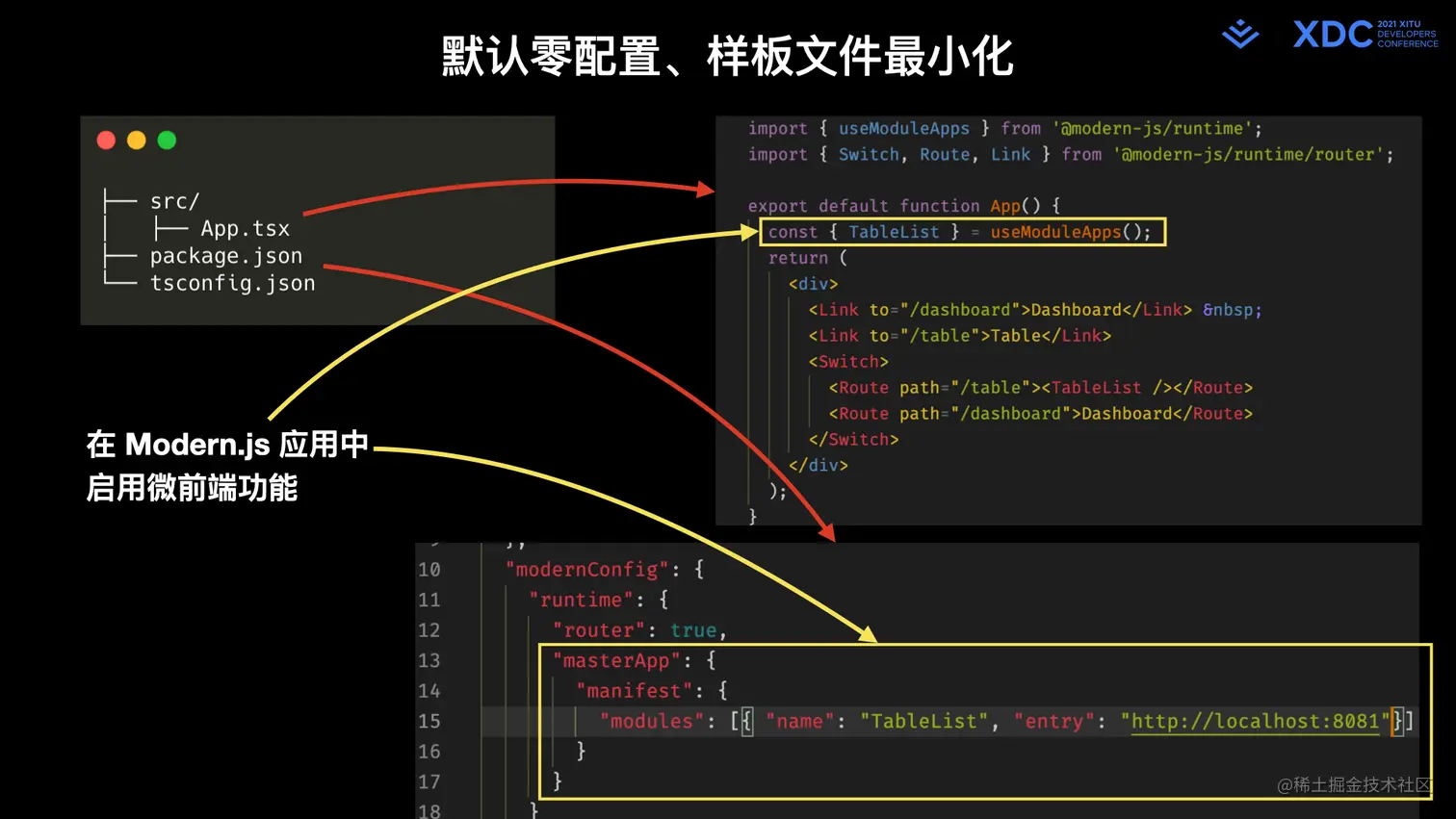 和以前把功能作为样板文件塞到项目里相比,现代 Web 开发范式下的最佳实践是默认零配置的,同时样板文件尽可能简洁最小化。之前我们也通过例子看到 Modern.js 项目手动创建非常简单,只需要应用根组件和 package.json。