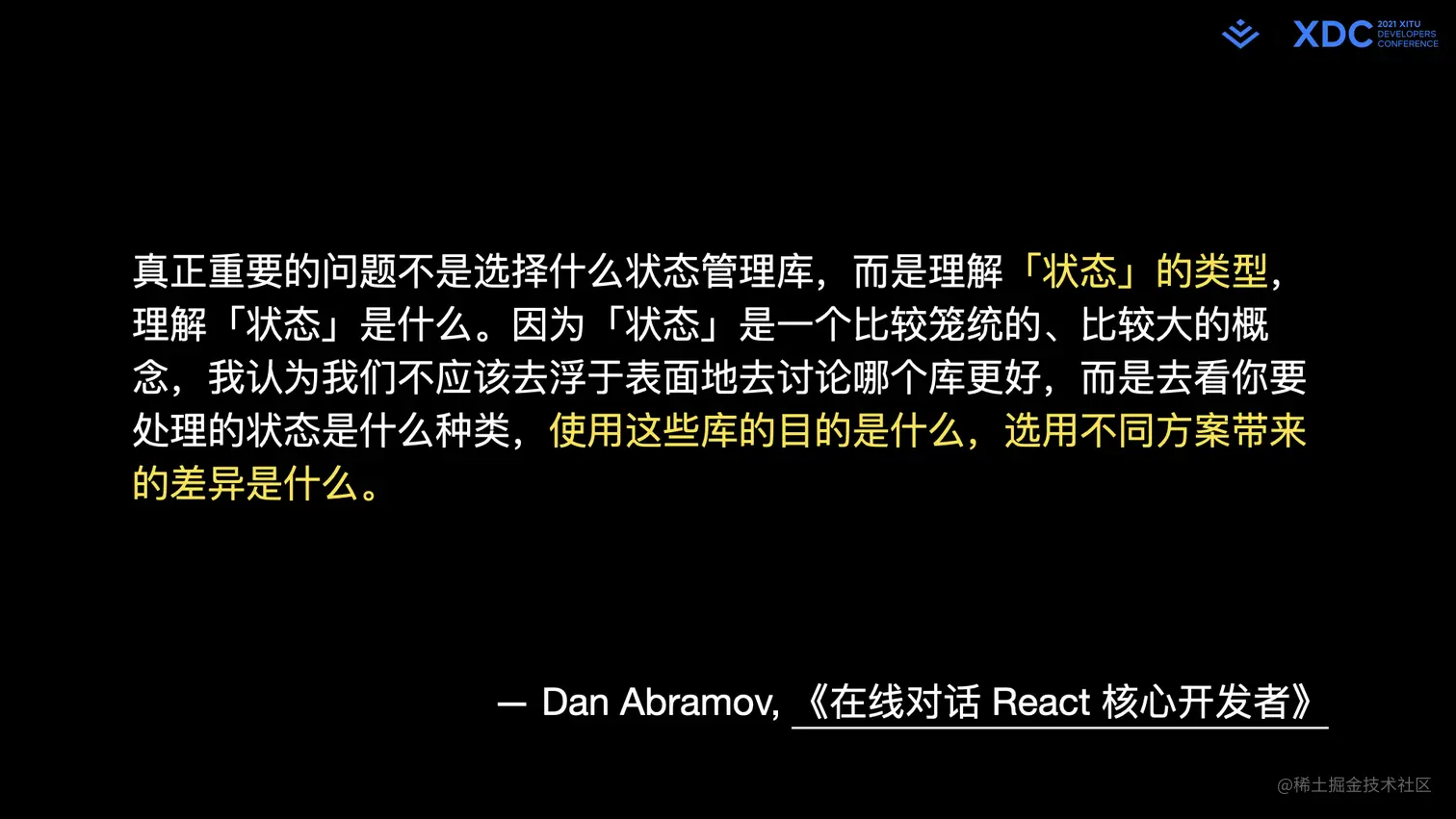 之前 Web Infra 举办的 React 核心开发者在线访谈里,Redux 作者 Dan 提到,状态管理最重要的是理解状态的类型,根据需要处理的状态是什么种类,来选择对应的方案。