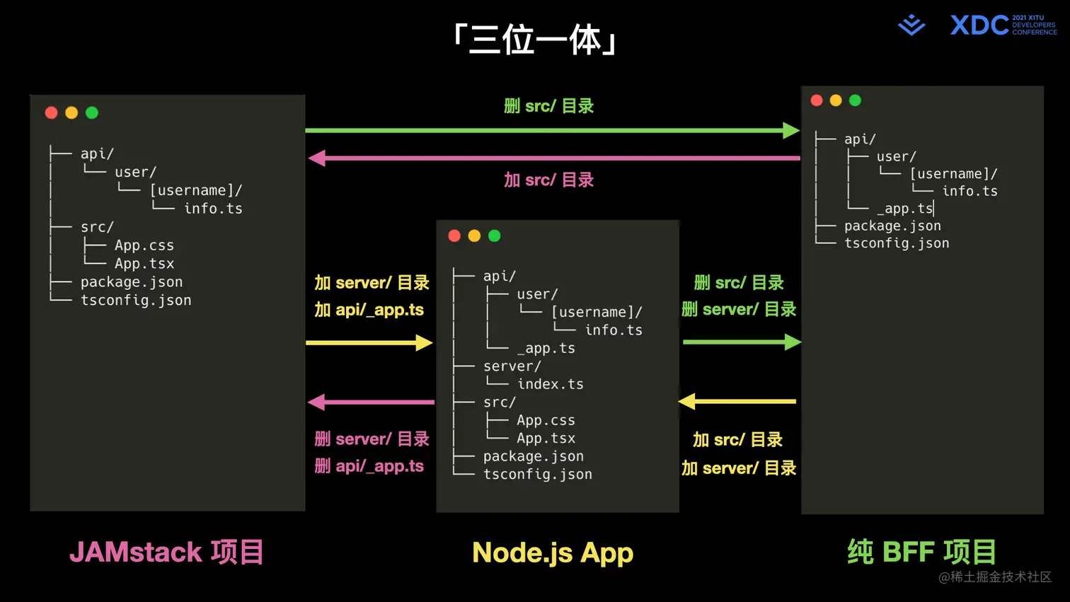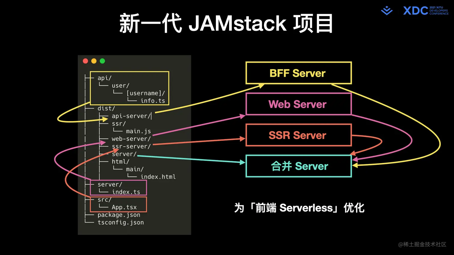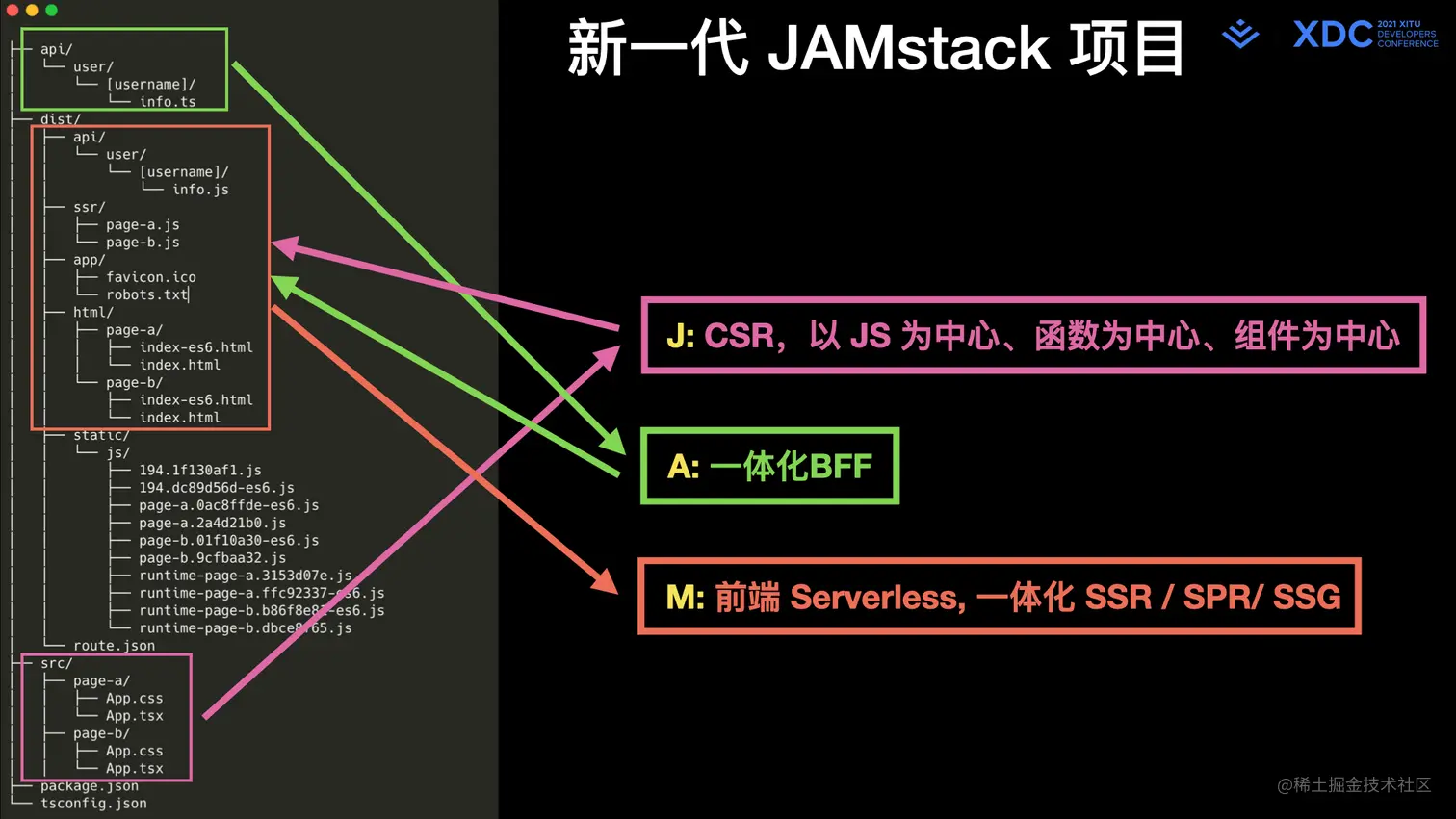 图上是用 Modern.js 的 demo 来展示新一代 JAMstack 项目。在开发中只需要聚焦在 JS 代码上,不论是 SPA 还是 MPA,HTML 都是自动生成的。不论是 SSR 渲染的代码,还是 API 逻辑,构建之后按照规范输出到 dist 下的不同目录,构建产物规范是 Serverless 友好的,支持把 Web、SSR、BFF 等拆分成不同服务器。