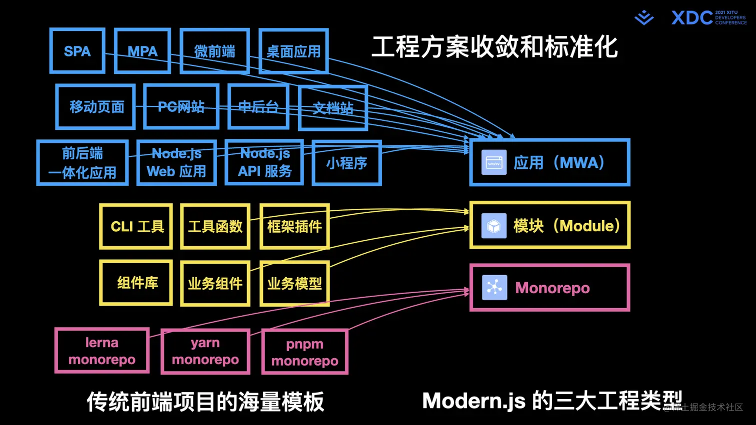 前面已经介绍过,我们将前端开发中涉及的场景收敛到 3 种:应用、模块和 monorepo。
