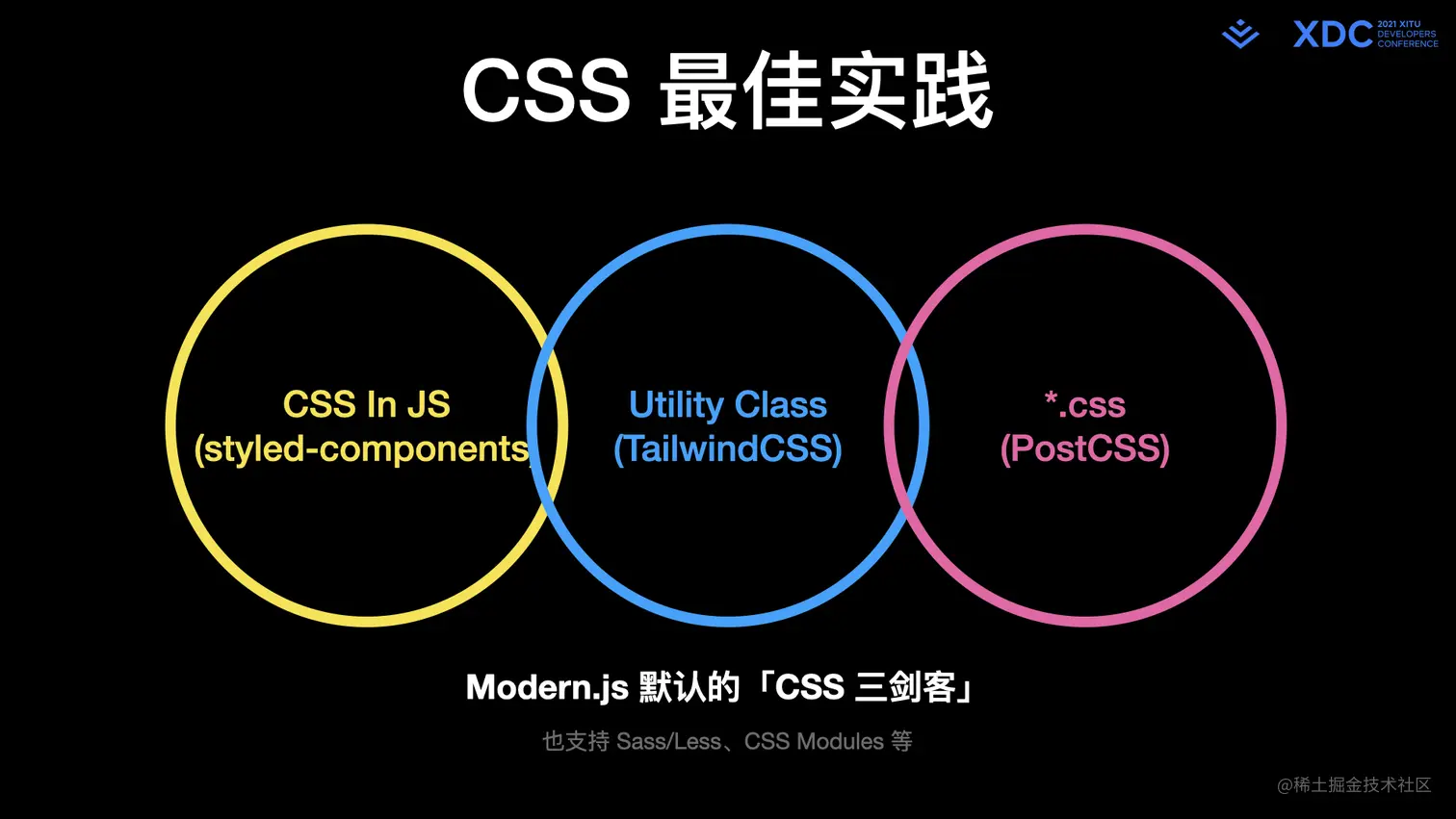 在 CSS 开发方面,Modern.js 默认推荐图上「CSS 三剑客」搭配使用,有需要也可以开启 LESS/SASS 等预处理器和 CSS Modules 支持。