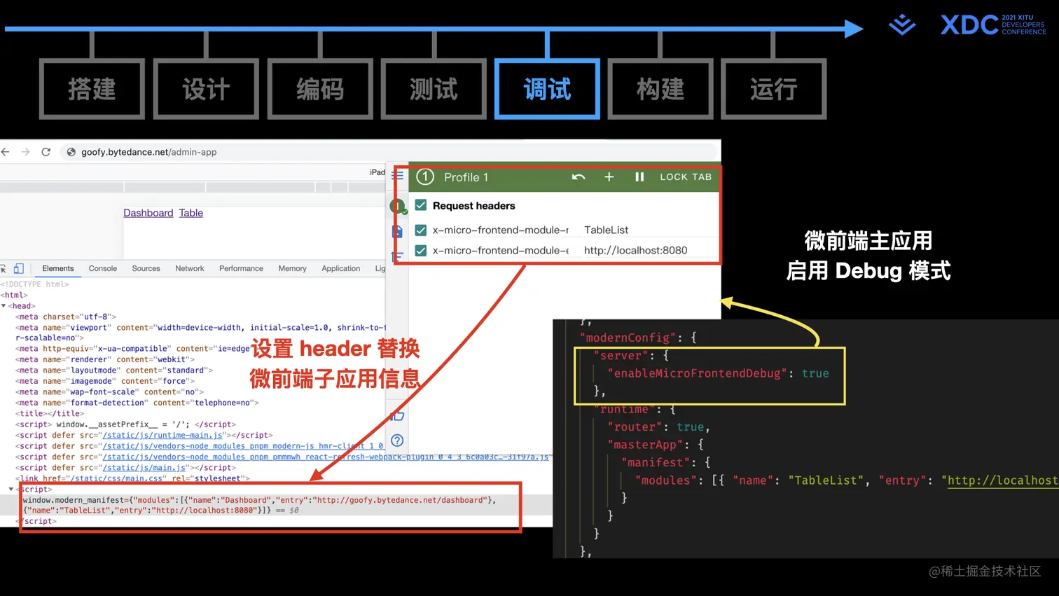 在 Modern.js 中,只需要主应用像图中右下角那样启用 DEBUG 模式,之后打开主应用线上链接,在 header 中设置需要开发的子应用信息,server 会自动替换注入到 html 中的子应用列表数据。这样也就可以让线上主应用加载本地子应用。