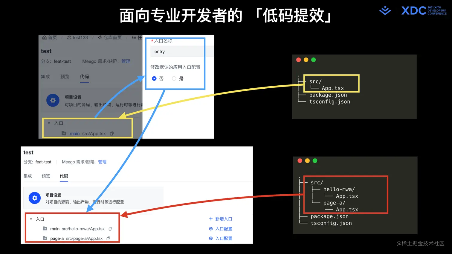 目前我们内部使用的研发平台,可以直接在图形界面上简单操作完成 项目的创建、开发、部署。图上右侧可以看到图形界面上展示了当前项目的的状态: 入口数量、项目配置等,蓝色框内添加应用的入口,一键从 「单入口」 转变为 「多入口」 。右侧在 Web IDE 中也能看到 src 目录结构下的变化。
