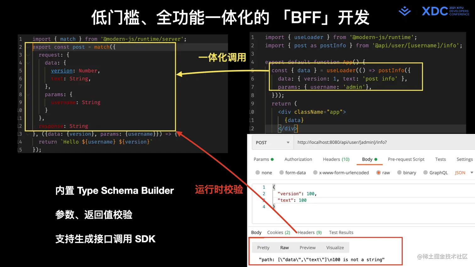 在 BFF 支持方面,Modern.js 中还提供了类型友好的方式,可以通过 Type Schema 实现运行时自动校验接口的参数和返回值。比如右下角请求时,参数 text 类型为 number 时,response 中会自动提示相应的错误。