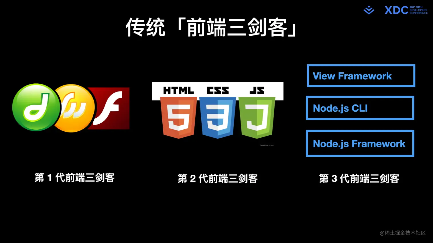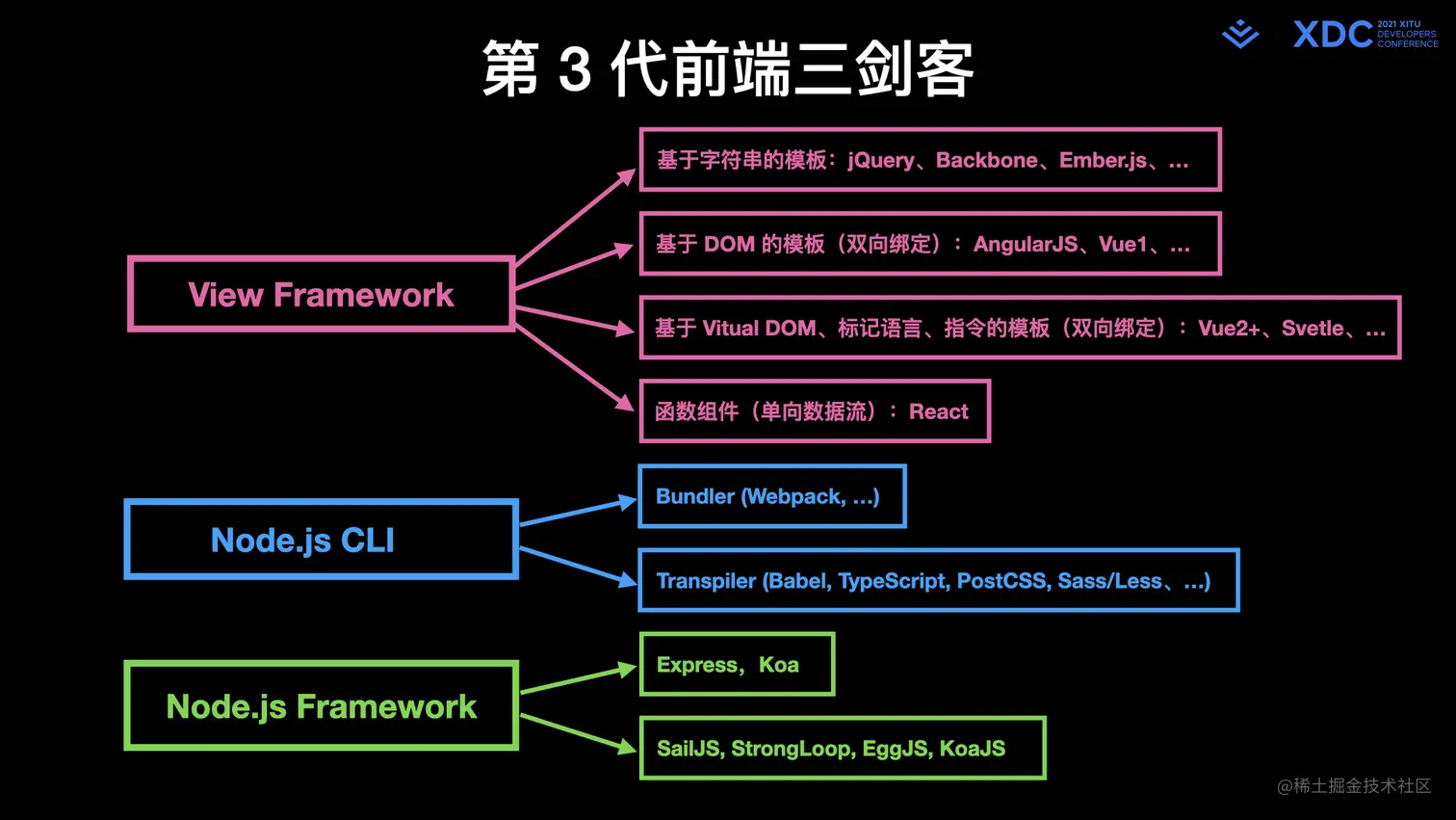 先来回顾下传统的「前端三剑客」,第 1 代和第 2 代如图上所示,也被大家熟知。而第 3 代「前端三剑客」由视图框架、Node.js 命令行、Node.js 框架三个方向组成。