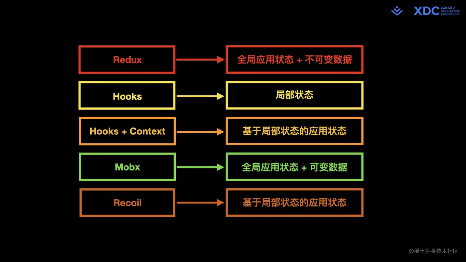 常见的状态管理方案,都有适合的状态类型和场景,很多时候需要混合使用,而不是一把锤子锤所有钉子,要么所有状态都放到全局应用状态里,要么所有状态都在局部状态里。