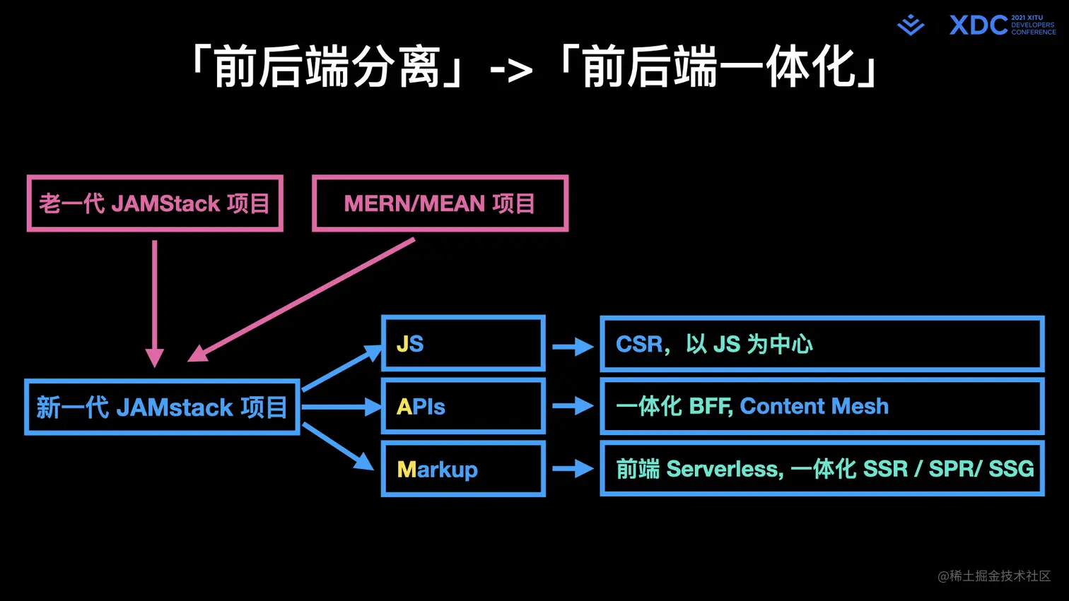Web 项目的技术栈也在转变,相当于是先发展出「前后端分离」,然后又用新方式回归了 「前后端一体化」