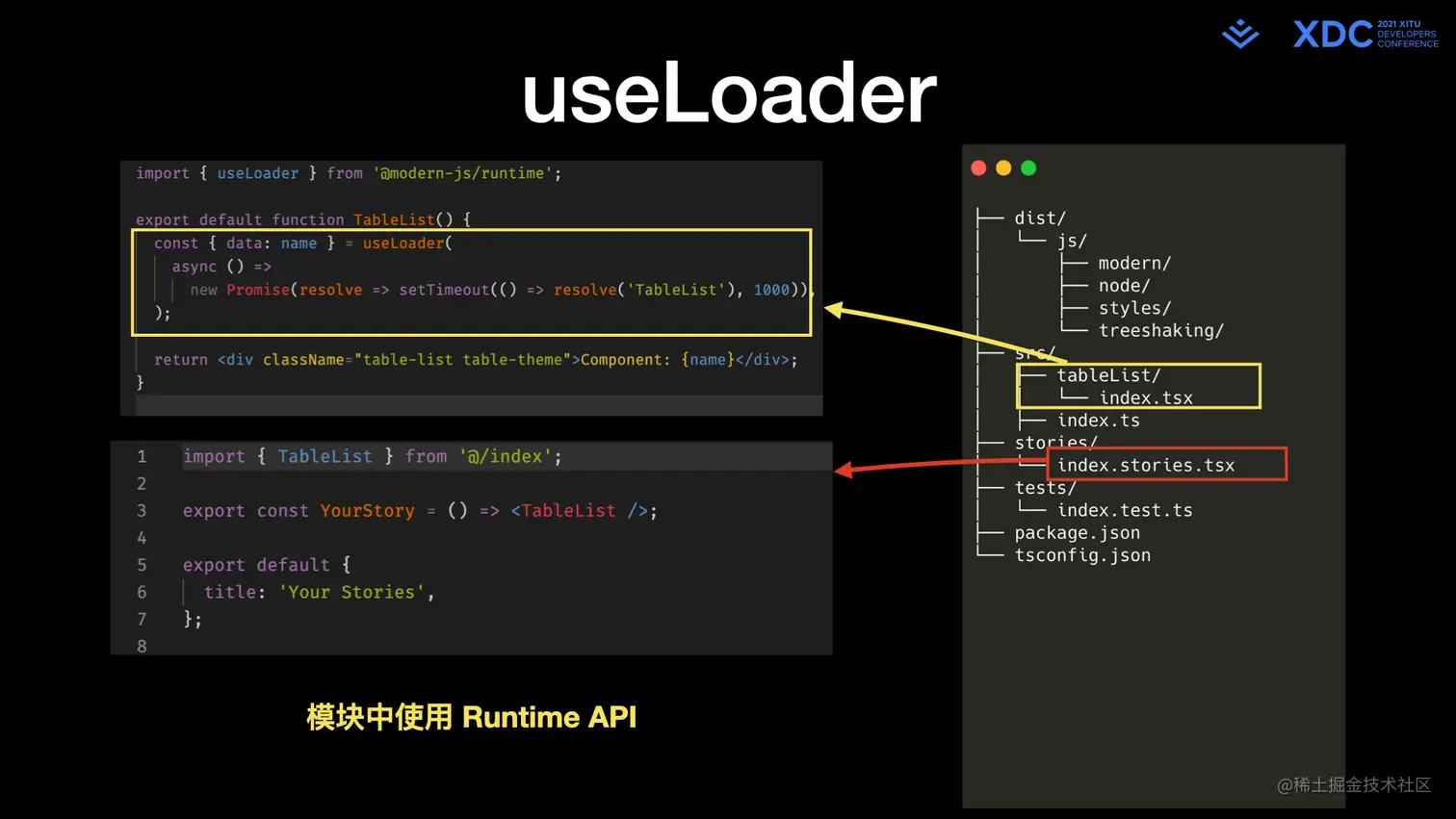 当应用中的组件需要拆分成独立的模块复用时,实现中用到的 Runtime API 还能正常调试、测试吗,答案是肯定的,这套 API 相当于「应用」领域的 API 标准库,不止能在 MWA 里使用,在 Modern.js 的「模块」工程方案里,同样可以使用这些 API,开发可复用的业务组件,支持独立调试和测试。上图右侧是模块工程的目录结构。左侧 TableList 组件中使用了 useLoader API,调试时只需要提供对应的 story 文件,模块工程方案支持我们在 Storybook 可视化测试以及单元测试中测试使用了 Runtime API 的组件。