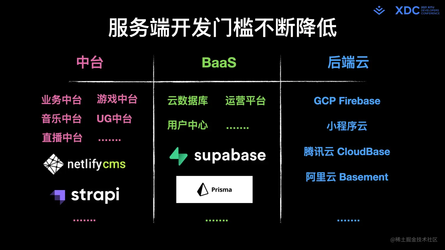 在这种客观趋势的推动下,基于 Web 技术的应用开发中,服务器端的占比和门槛一直在不断下降,国内大厂的中台建设,提供了大量不跟特定客户端捆绑、专注于数据需求和底层业务逻辑的 API,让产品开发更聚焦在上层的客户端业务逻辑。还有 BaaS 和基于云函数的后端云 Serverless,也进一步降低服务器端的门槛,让前端开发者能更独立的、端到端的完成产品开发。