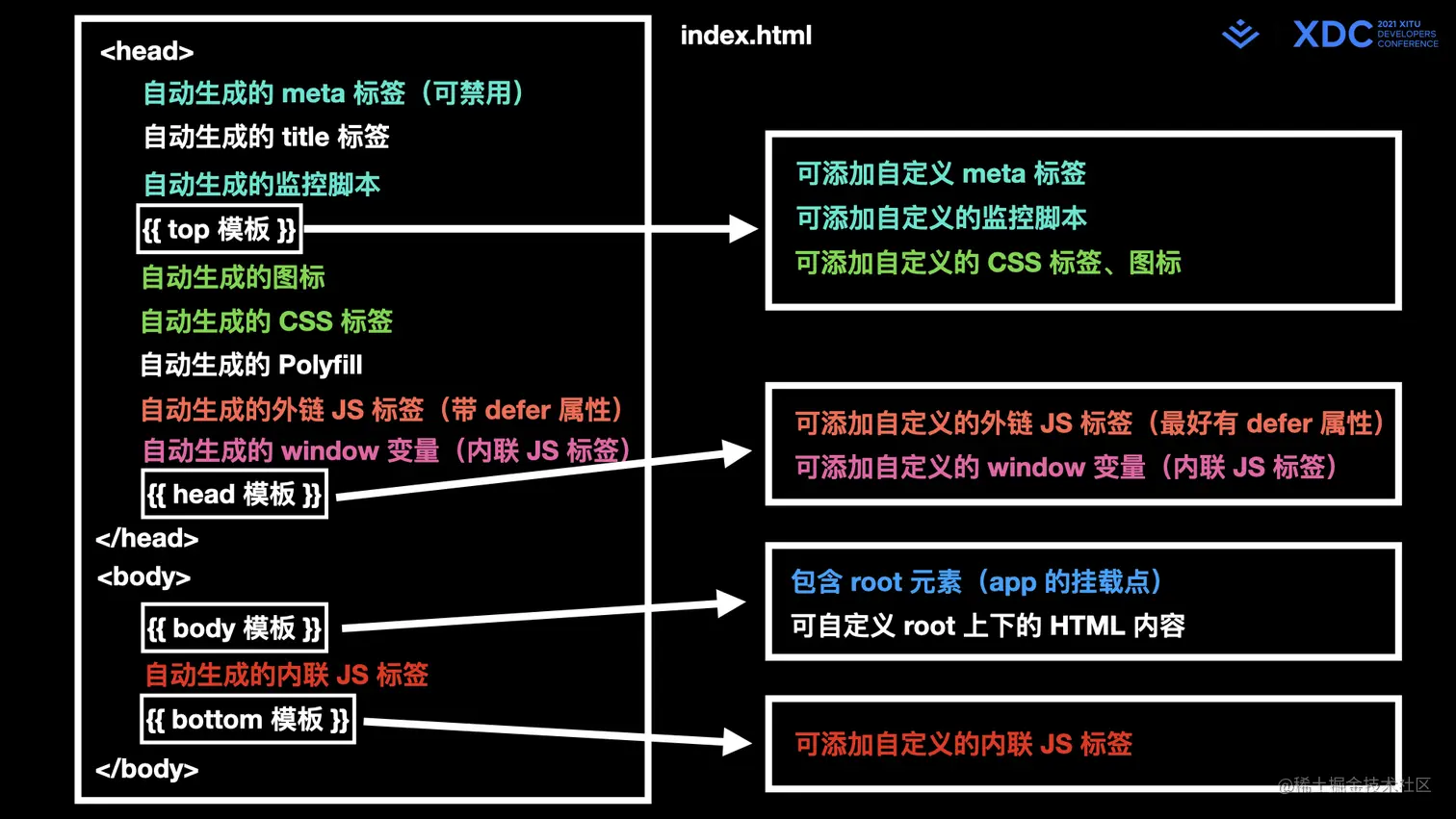 前面提到 Modern.js 倾向于 JS 为中心、自动生成 HTML。但不阻碍开发者自己掌控 HTML。图上是 Modern.js 渲染 HTML 的默认模板。