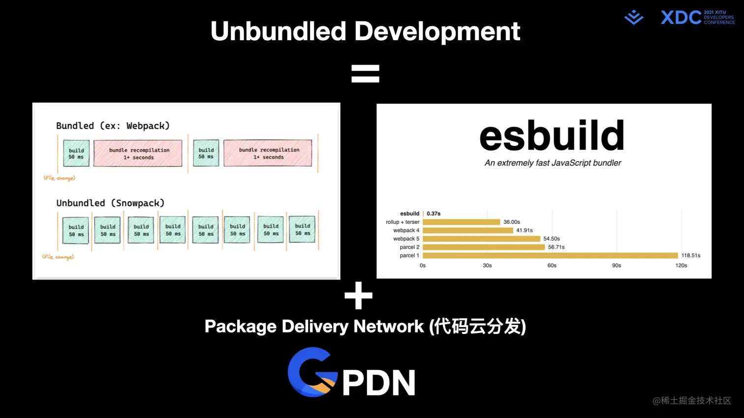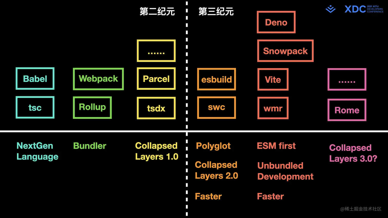 从第三纪元开始 esbuild、swc 这种编译打包工具使用非 JS 的系统编程语言开发,显著提高编译速度。编译时间的缩减也意味着不打包,按需编译的 ESM 场景可以实现。
