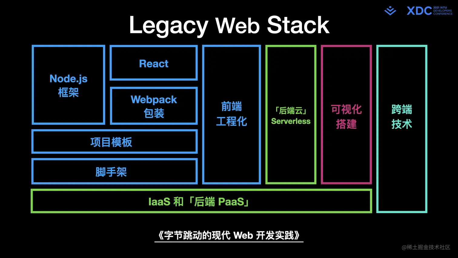 今年7月,我们做过一次主题是《字节跳动的现代 Web 开发实践》的分享,在分享中我们梳理了「传统前端技术栈」的典型组成部分,展示了其中每个部分都存在的瓶颈问题。