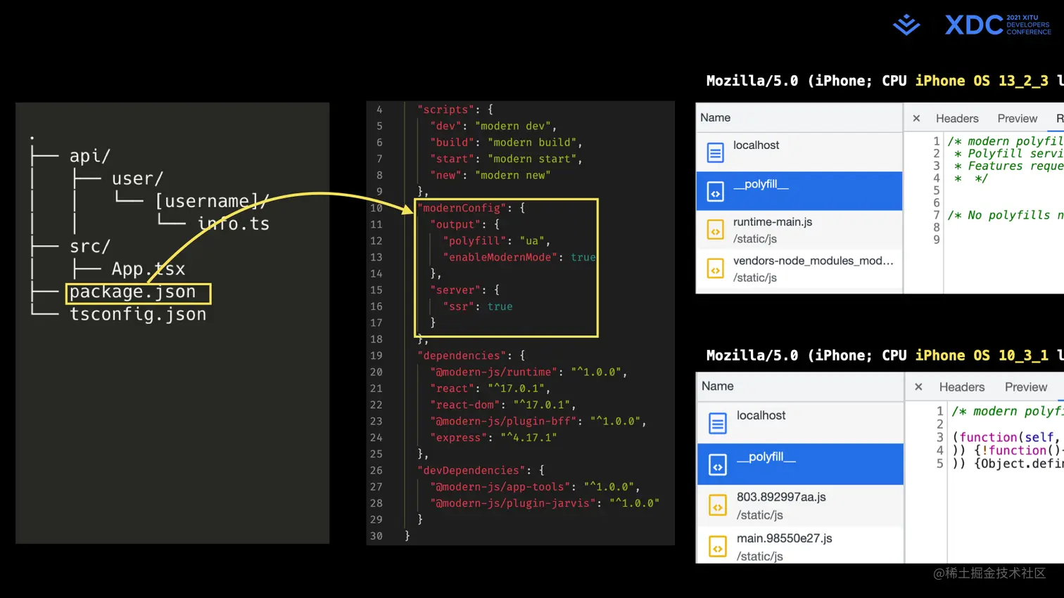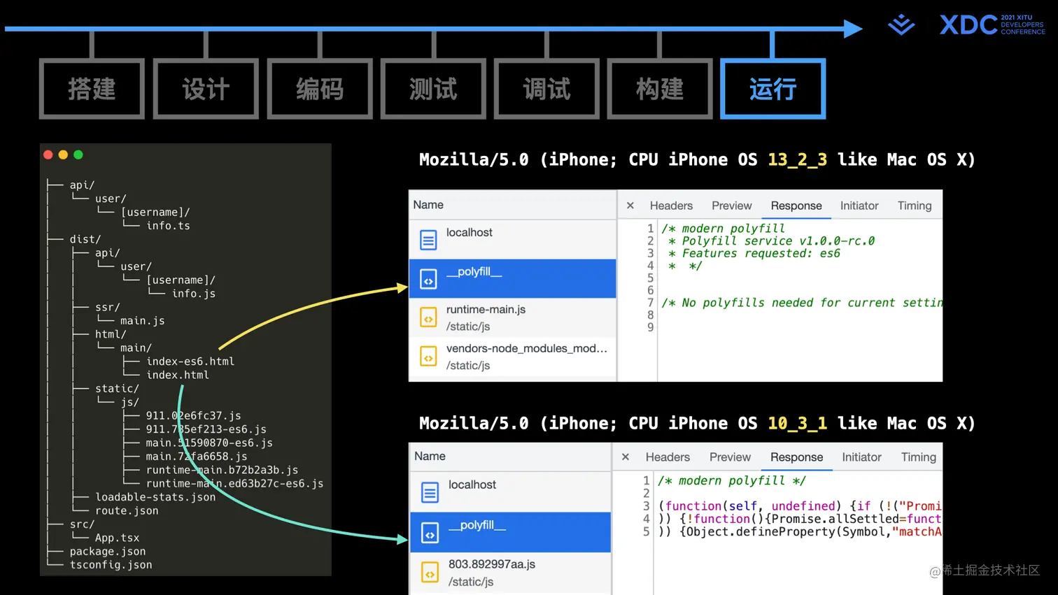 构建后,幻灯片左侧可以看到产物里的 HTML 和 JS 都有 es6 和 es5 两个版本,用户访问时应用的时候,Modern.js 的 Web Server 会根据浏览器 UA 选择分发 es6 版本还是 es5 版本,也就是「差异化分发」。