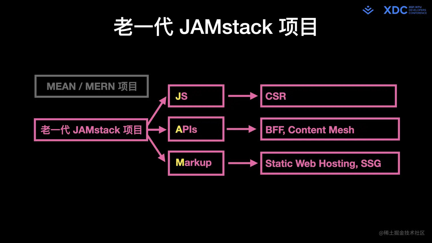 「老一代 JAMstack」最大的问题是,虽然分离成了独立的项目,却不足以承担完整的应用开发,只能产出静态文件,依靠外部的 Web 服务器去运行,无法实现 SSR,三大组成部分里的 API,也需要在项目之外,用云函数、独立后端项目等方式来实现,不能跟着项目一起迭代。