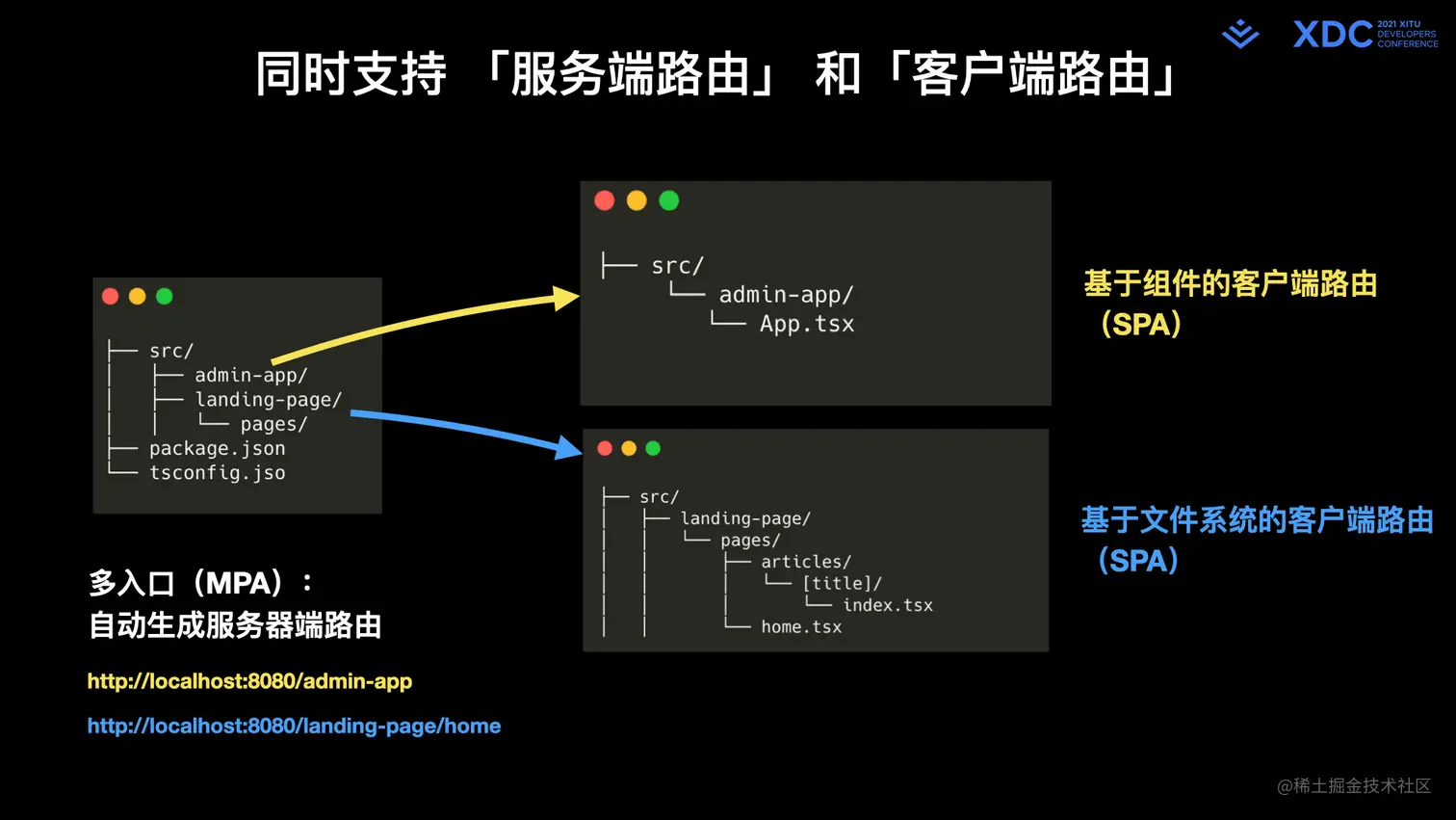 我们之前的例子都是单入口应用,只需要把 App.tsx 组件、pages 目录这样的入口标识放到 src 的子目录里,就能将单入口应用变成多入口的 MPA。会基于入口名称,自动生成服务器端路由,比如图上的 admin-app 和 landing-page 两个入口的 URL。