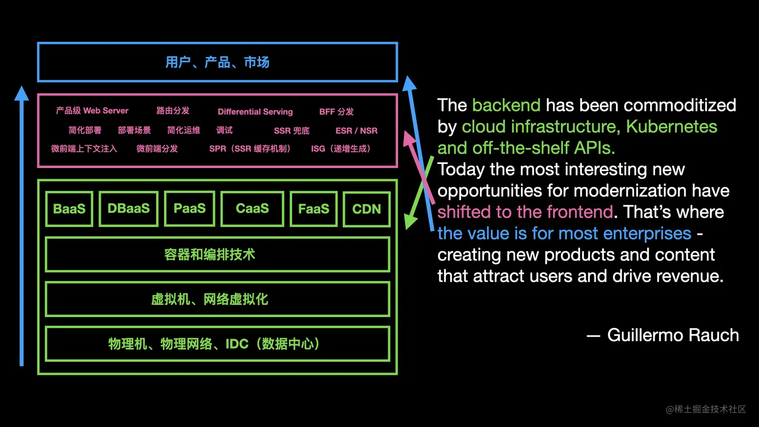 就像幻灯片上这张图,云计算和研发产品最初是从最接近机器的底层开始发展,从虚拟化,到容器编排,到基于容器技术的各种平台化、服务化的研发工具形态,这个阶段是后端技术主导的,整个趋势是越来越向上层发展,越来越接近市场和商业价值最终所在的地方——也就是面向用户的产品,因此必然会发展到前端技术主导的抽象层,让应用开发和产品开发能更专注于用户需求,而越来越不需要关心服务器端的复杂性和专业技术细节。