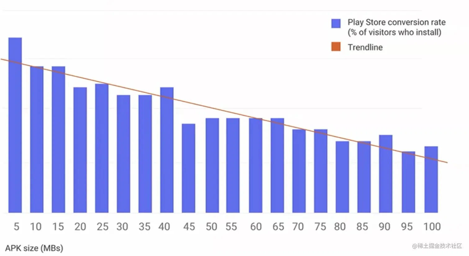 上图是Google透露的安装包体积与下载转化率的关系图(来自Google Play)