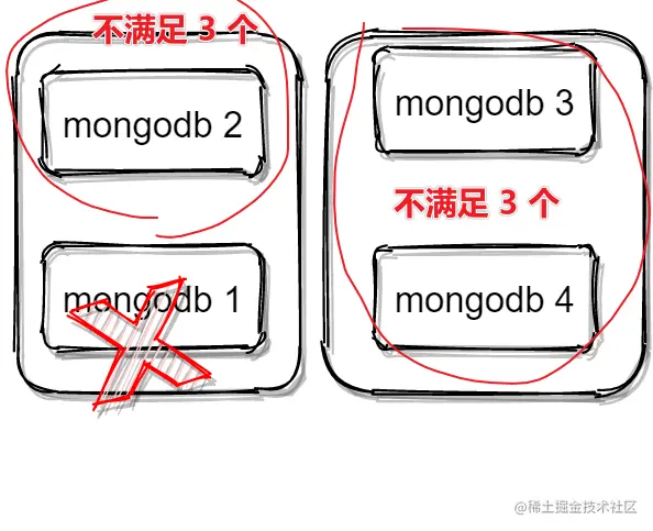 若 这 4 个 mongodb 副本 分别部署在网络不通的 2 个机房里面,这个时候 其中 1 个副本挂掉,