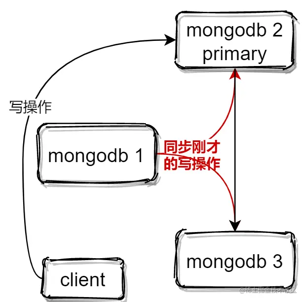 那么,刚才的写操作,由于主副本挂掉,没有及时将数据同步到 次副本,那么mongodb 集群里面会开启重写,重新将刚才的写操作写入到新的主副本中
