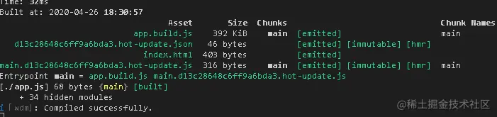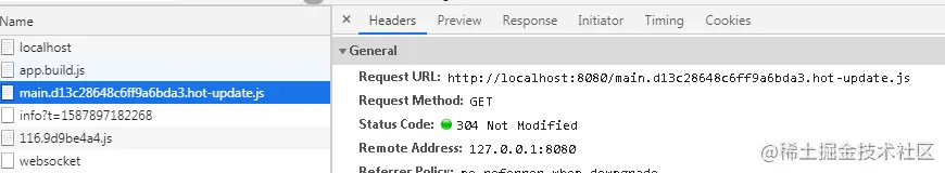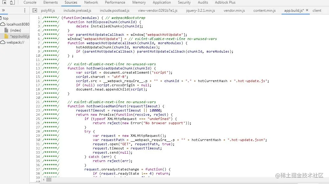 - webpack --watch启动监听模式之后,webpack第一次编译项目,并将结果存储在内存文件系统,相比较磁盘文件读写方式内存文件管理速度更快,内存webpack服务器通知浏览器加载资源,浏览器获取的静态资源除了JS code内容之外,还有一部分通过webpack-dev-server注入的的 HMR runtime代码,作为浏览器和webpack服务器通信的客户端( webpack-hot-middleware提供类似的功能)。截图如下: