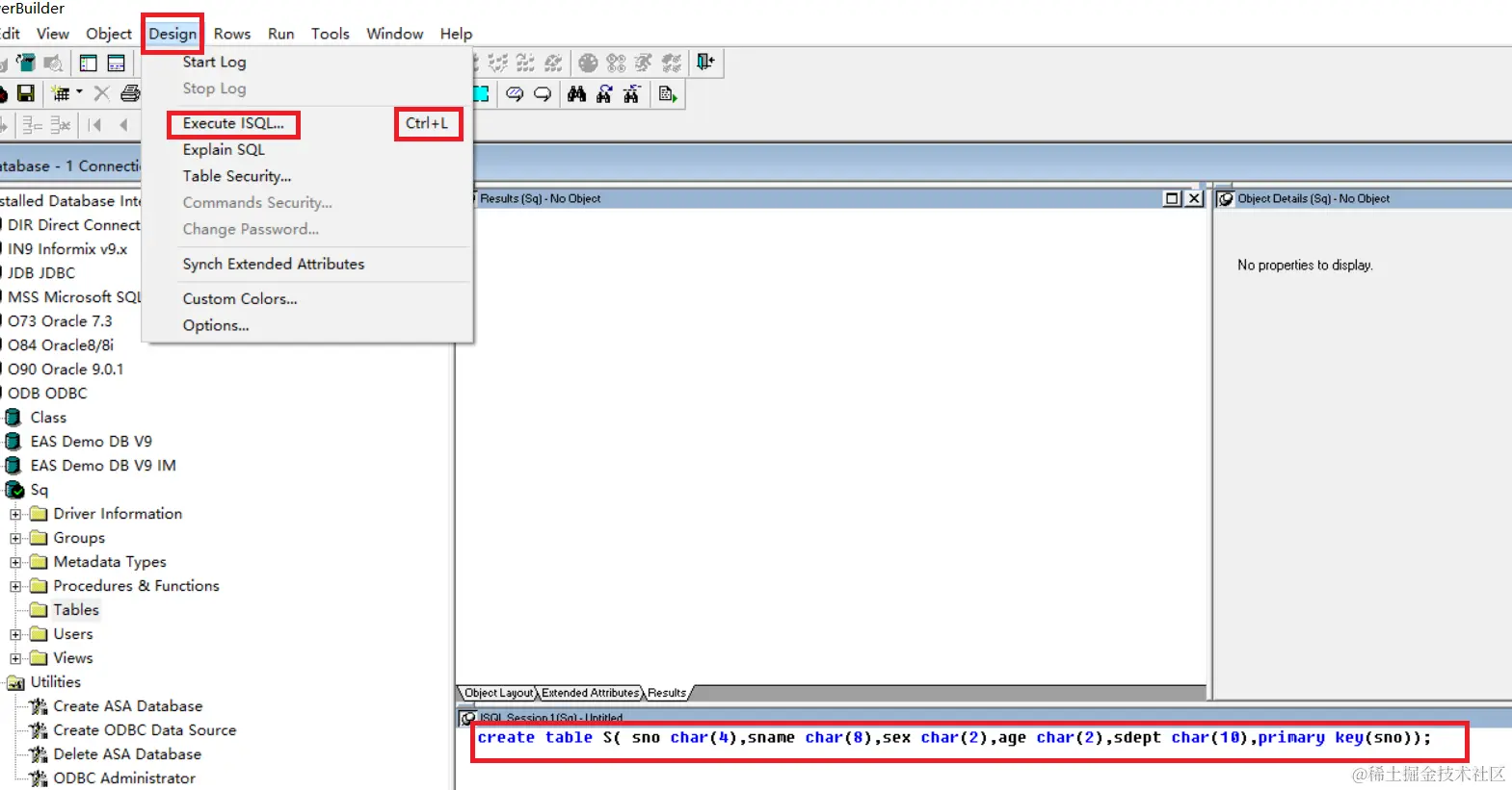 输入代码以后一点击Design然后选择Execute ISQL……进行运行或者使用快捷键Ctrl+L