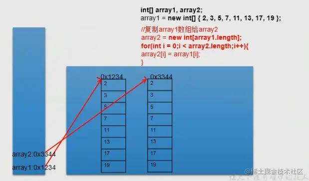 我们通过new的方式,给array2在堆空间中新开辟了数组的空间,将array1的元素一个一个的赋值到array2数组中