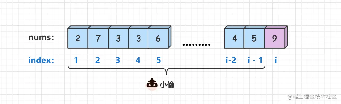 i - 2间房间和最后一间房间 (相邻的房屋不可闯入),那么问题就转化为了偷窃1号到i- 2号房间所能获得的最高金额再加上偷窃第i号房间的金额,即f[i] = f[i - 2] + nums[i]。 (下标均从1开始)
