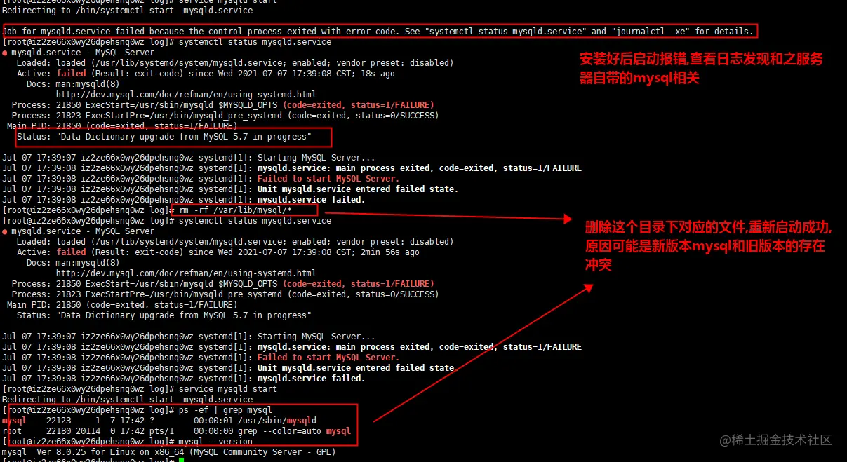 根据报错信息执行: systemctl status mysqld.service" 或者 "journalctl -xe"命令查看报错详情,发现报错信息中存在: Data Dictionary upgrade from MySQL 5.7 in progress。