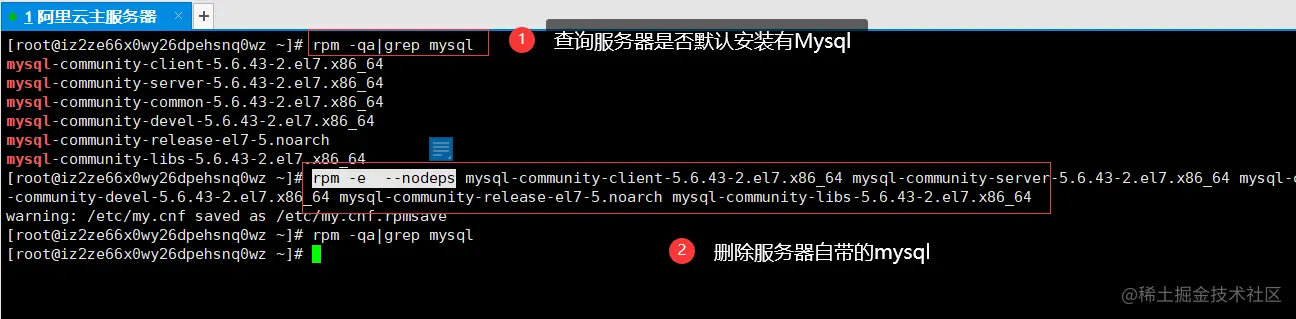 1、rpm -qa|grep mysql -- 查询服务器是否有mysql,如有,则执行下面的语句进行删除