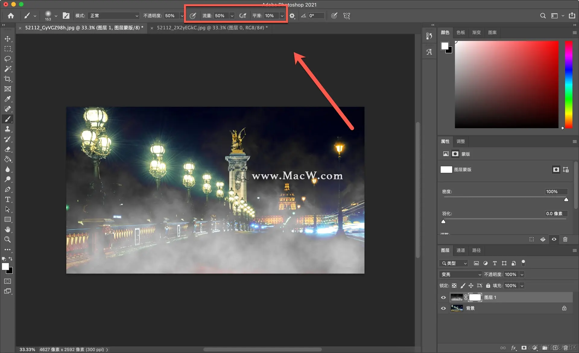在工具的选项栏中「不透明明度 」设置为50%,旁边的「流量」为50%。
