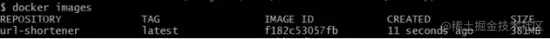 随后,我运行命令:mvn clean package,以构建出一个Docker镜像。接着,在Dockerfile文件夹中,我运行了命令:docker build -t url-shortener:latest。其中,-t可用于标记一个镜像,并实现版本控制。在此,即为最新的存储库URL-shortener。我们可以使用命令“docker images”来创建镜像。屏幕上的显示结果为: